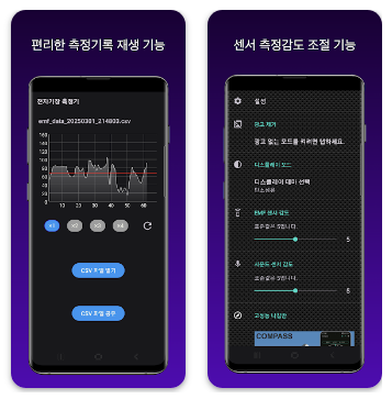 먼저, 고정밀 전자기장 측정 기능을 통해 마이크로테슬라(μT) 단위로 실시간 값을 확인할 수 있으며, 측정값은 그래프 형태로 시각화되어 변화 추이를 쉽게 확인할 수 있습니다.