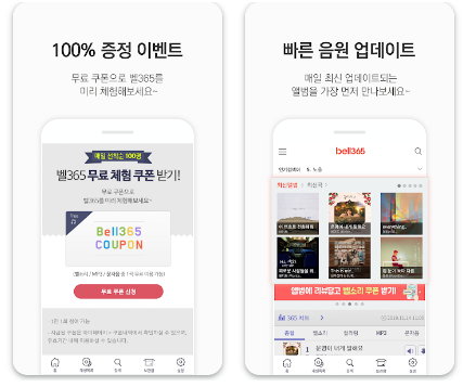 또한 쿠폰 이벤트를 활용하면 유료 음원도 무료로 이용할 수 있으므로 앱 실행 후 이벤트 메뉴를 꼭 확인하는 것이 좋습니다.
